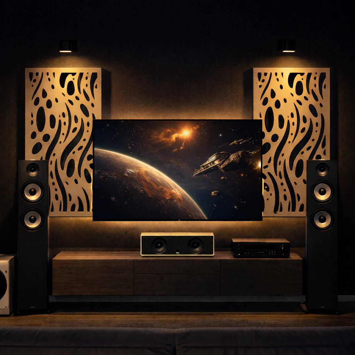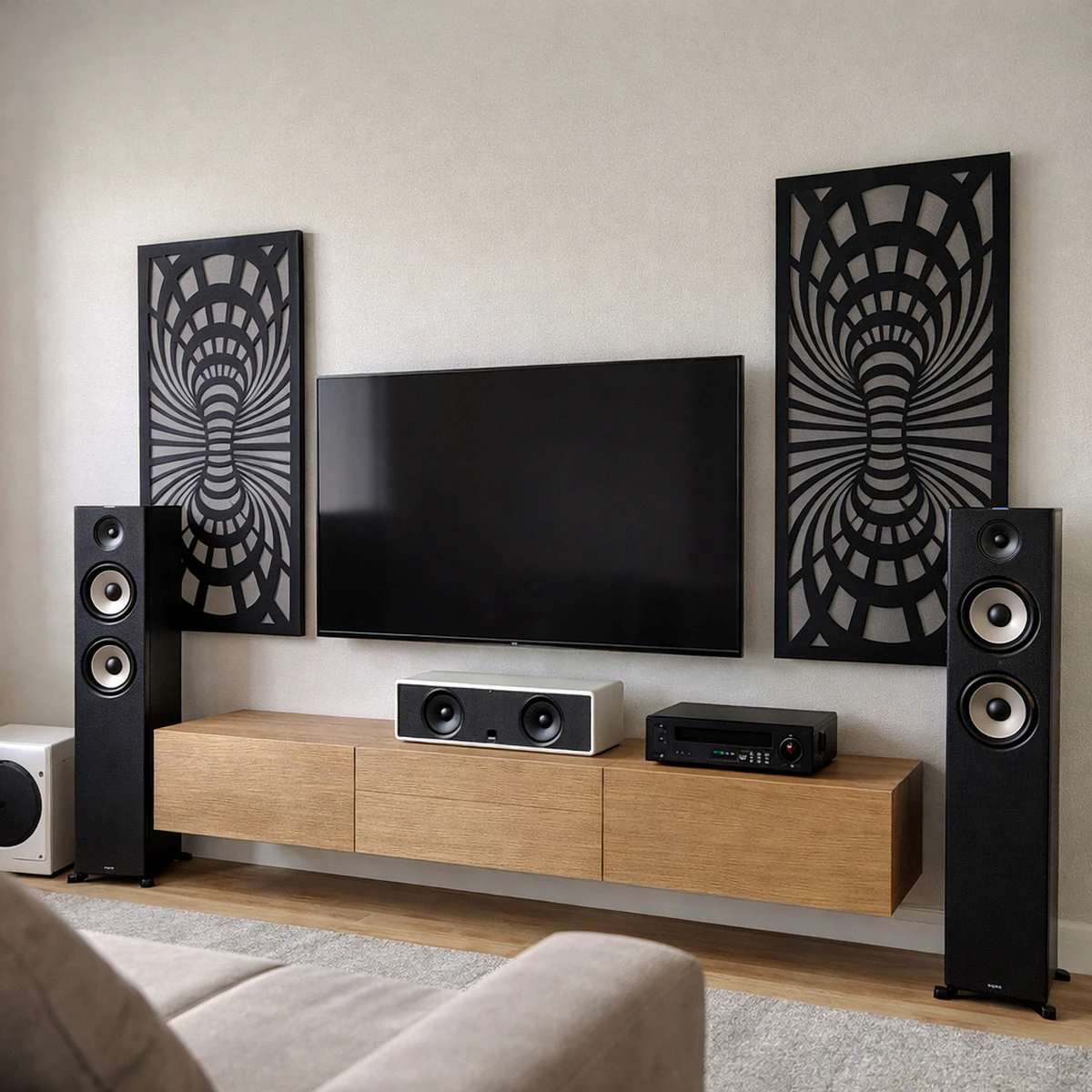Each handcrafted acoustic element is engineered to optimize sound reflection distribution within any space, improving sound perception in various audio and music environments. Our panels, equipped with diffusers, are tailored to provide a precise and enjoyable listening experience, enhancing detail and offering a comprehensive surround effect. They effectively minimize standing waves, refining the acoustic quality of the room and making individual frequencies stand out. This precision makes them ideal for use in studios, recording and control rooms, as well as cinema and hi-fi systems.